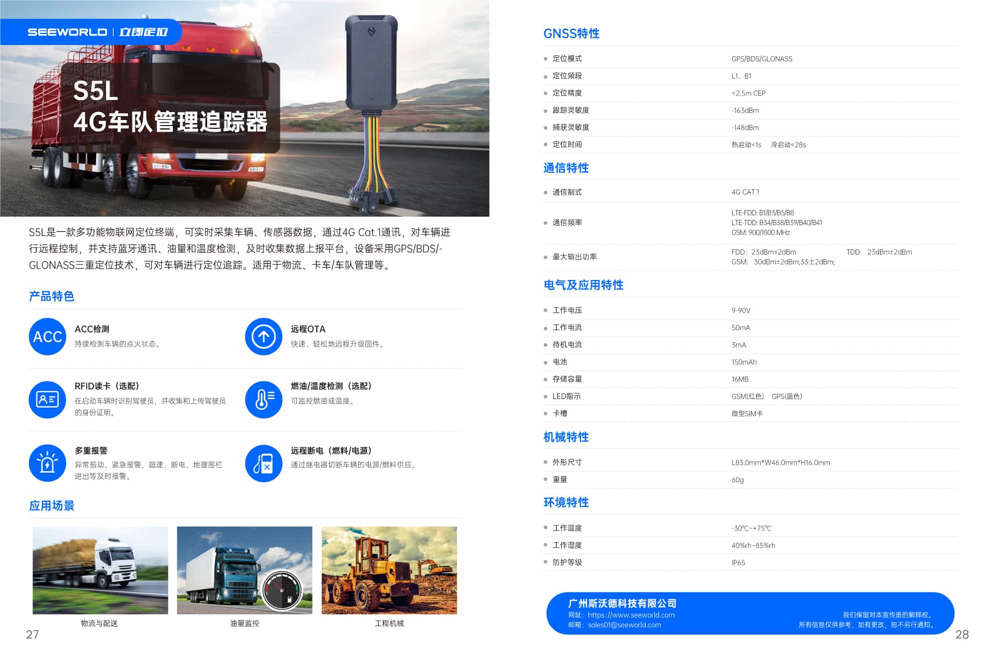 S5L是一款多功能物聯網定位終端,可實時采集車輛、傳感器數據,通過4G Cat.1通訊,對車輛進行遠程控制,并支持藍牙通訊、油量和溫度檢測,及時收集數據上報平臺,設備采用GPS/BDS/-GLONASS三重定位技術,可對車輛進行定位追蹤。適用于物流、卡車/車隊管理等。
