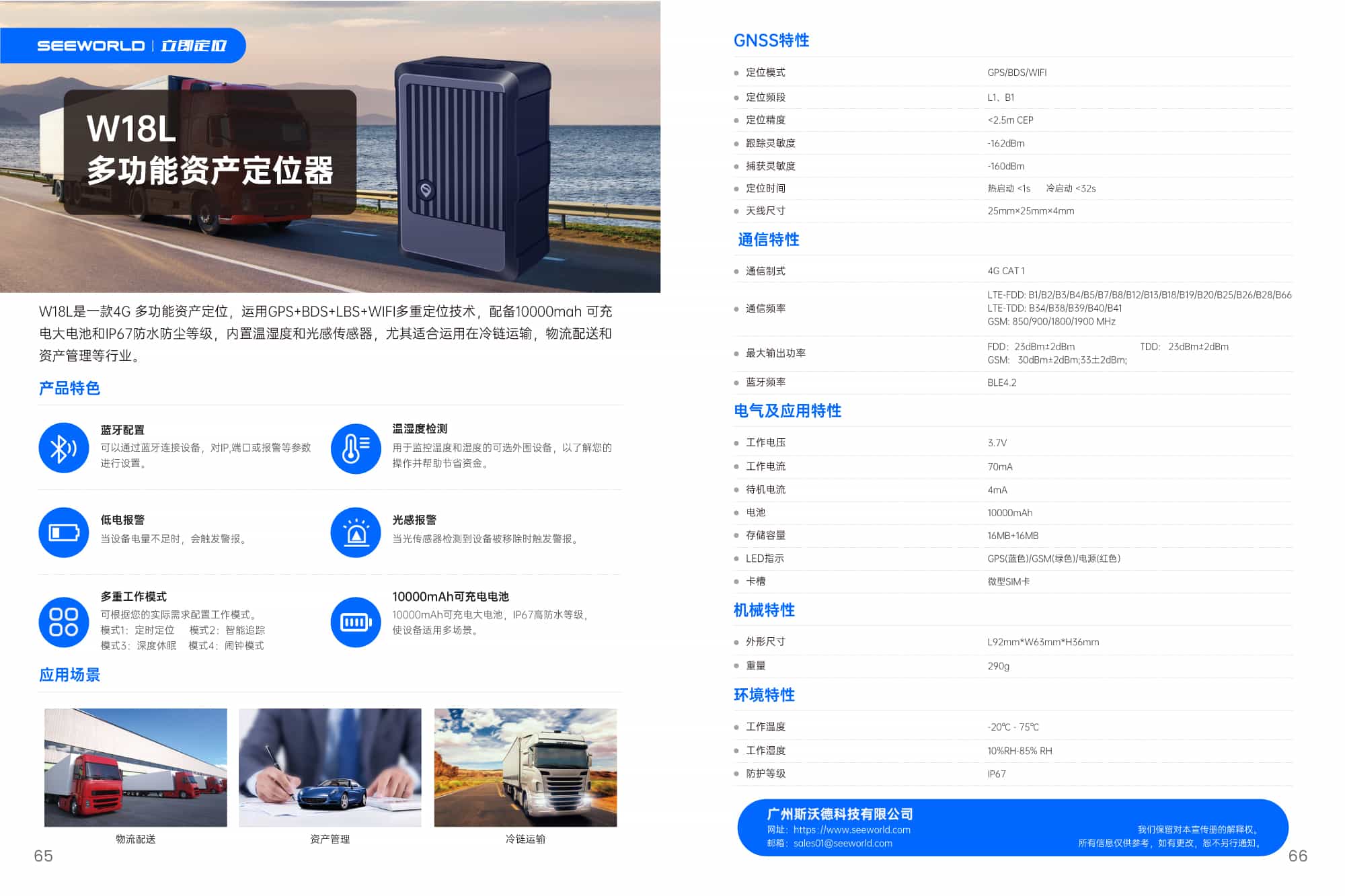 W18L是一款4G 多功能資產(chǎn)定位,運(yùn)用GPS+BDS+LBS+WIFI多重定位技術(shù),配備10000mah 可充電大電池和IP67防水防塵等級,內(nèi)置溫濕度和光感傳感器,尤其適合運(yùn)用在冷鏈運(yùn)輸,物流配送和資產(chǎn)管理等行業(yè)。